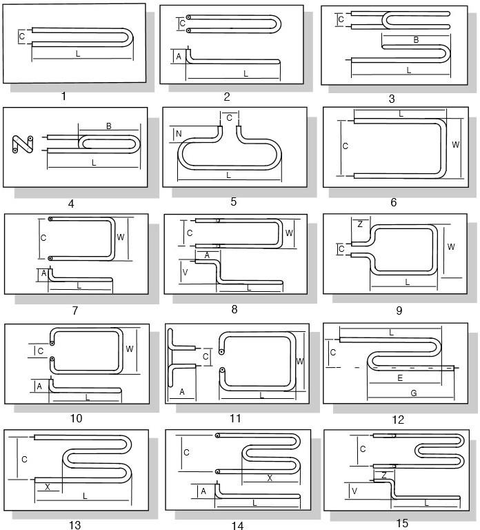 To bend up an element, we will need certain exact measurements depending on your needs. The sample drawings below are the more common shaped heating elements. These drawings may help you in determining the measurements you require when asking for a quote or ordering your heating element.